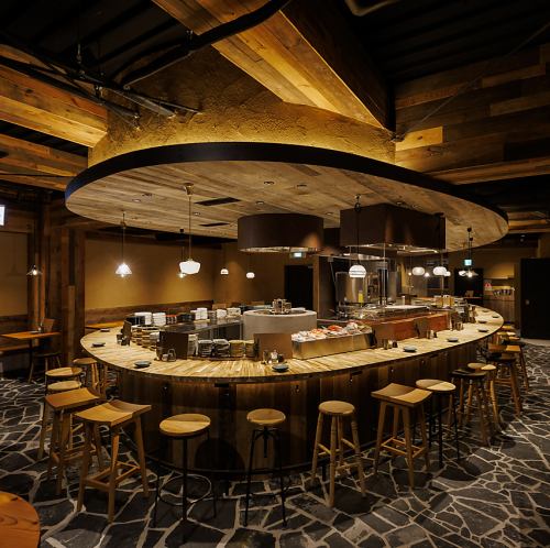 非日常的なライブ感満載の、広々としたカウンターやモダンな内装で炉端焼きや様々なお料理を堪能♪